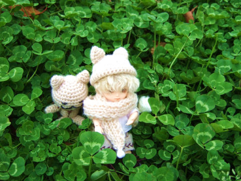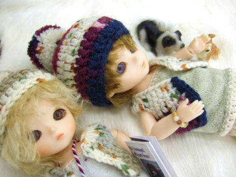 そこに彼女がドール用に販売している同じ素材のカエル帽子をかぶせて、ドールとあみぐるみを並べてみると・・・ふふふ♪